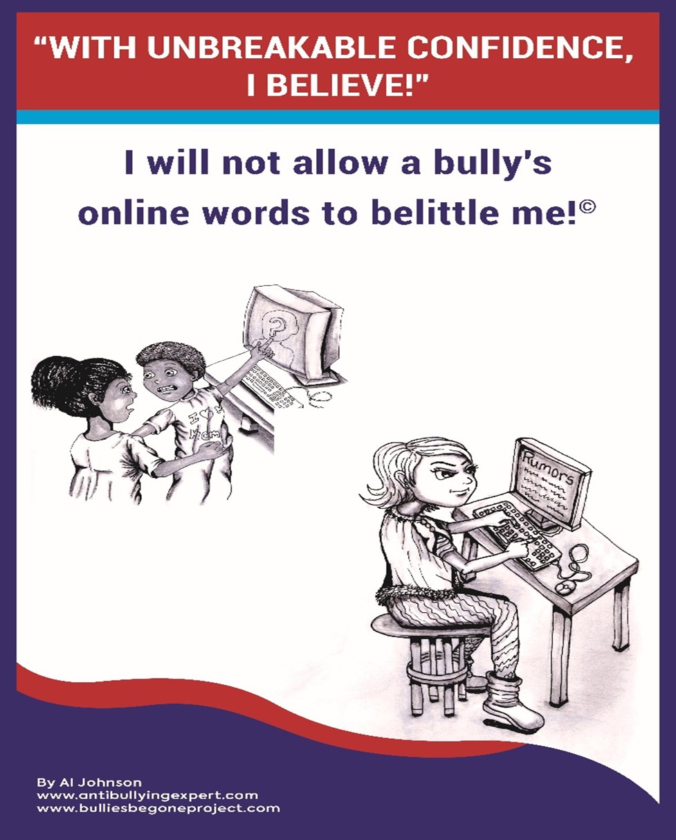 The artwork shows a student confidently facing down online rumors while another scene highlights the support of friendship — reinforcing the message that strength and community overcome digital cruelty.